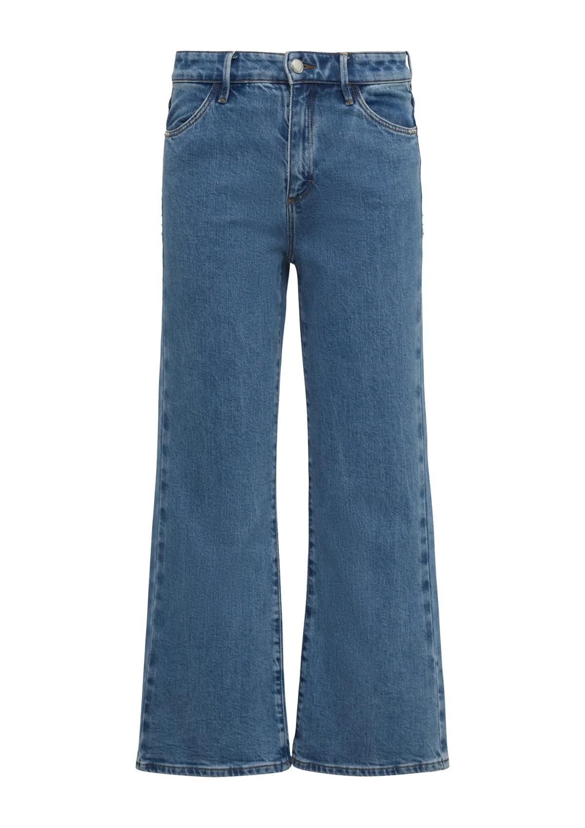Design: Gevoerde zoom/rand, Ritssluiting, 5-pocket-style; Type sluiting: Ritssluiting; Materiaal: Denim; Motief: Effen; Extra's: Contrasterende naden, Vaste grip, Riemlussen; Wassing: Blauw denim; Lengte: 7/8 lengte; Pasvorm: Flared; Taillehoogte: High waist