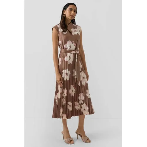 Dames jurk van satijn van s.Oliver BLACK LABEL;look: all-over motief;Pasvorm: regular fit;Lengte: midi;Hals: Cascade;Patroon: abstract, bloemig;Details: elastische band, plissérokdeel;sluiting: naadritssluiting, tailleriem om te strikken;mouwvorm: zonder mouwen;materiaalverwerking: plissés, satijn