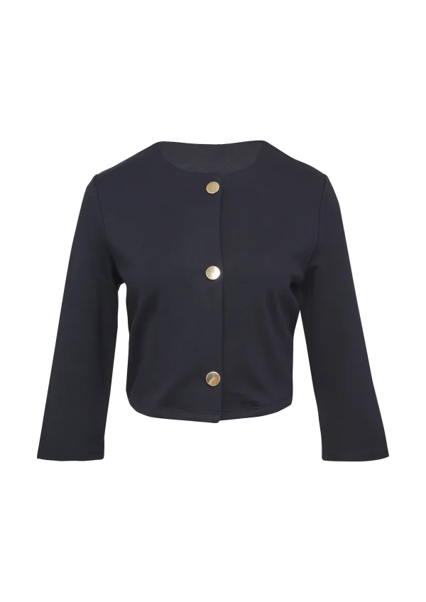 Design: Gevoerde zoom/rand; Type sluiting: Knoopsluiting; Type jas: Indoor; Voering: Licht gevoerd; Materiaal: Viscose; Motief: Effen; Extra's: Op staal naden; Pasvorm: Normale pasvorm; Armlengte: Driekwart mouw; Lengte: Korte pasvorm
