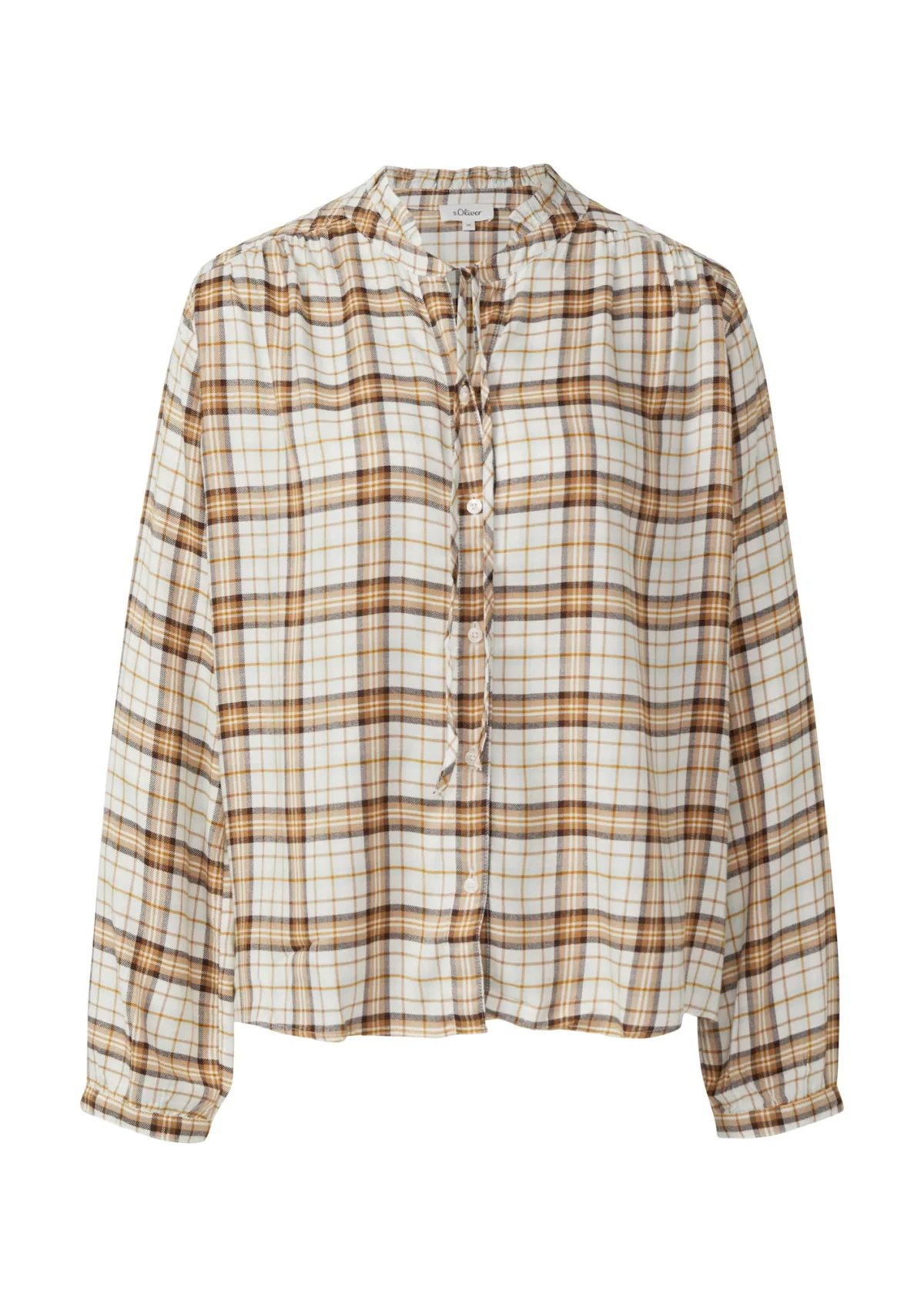 Blouse type: Klassieke blouse; Design: 1-knoops manchetten; Type sluiting: Knoopsluiting; Materiaal: Viscose; Motief: Geruit; Kraag: Opstaande kraag; Details: Ruches, Gedrapeerd; Pasvorm: Normale pasvorm; Armlengte: Lange mouw; Lengte: Normale lengte