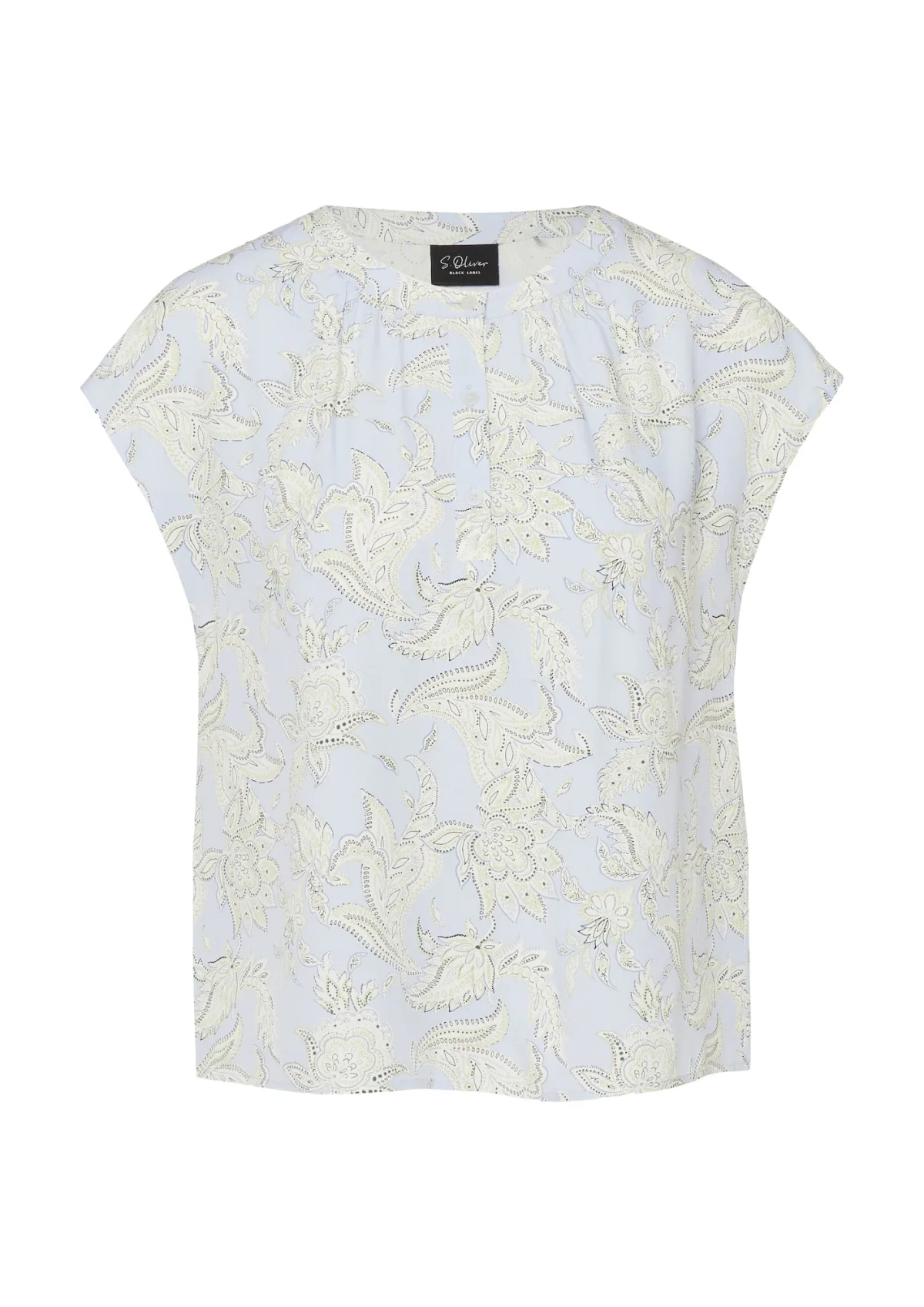dames blouse van s.Oliver BLACK LABEL;look: all-over motief;Pasvorm: regular fit;Details: overlappende schouders;Hals: ronde hals;sluiting: korte knoopsluiting;mouwvorm: zonder mouwen;Materiaal: zuiver viscose