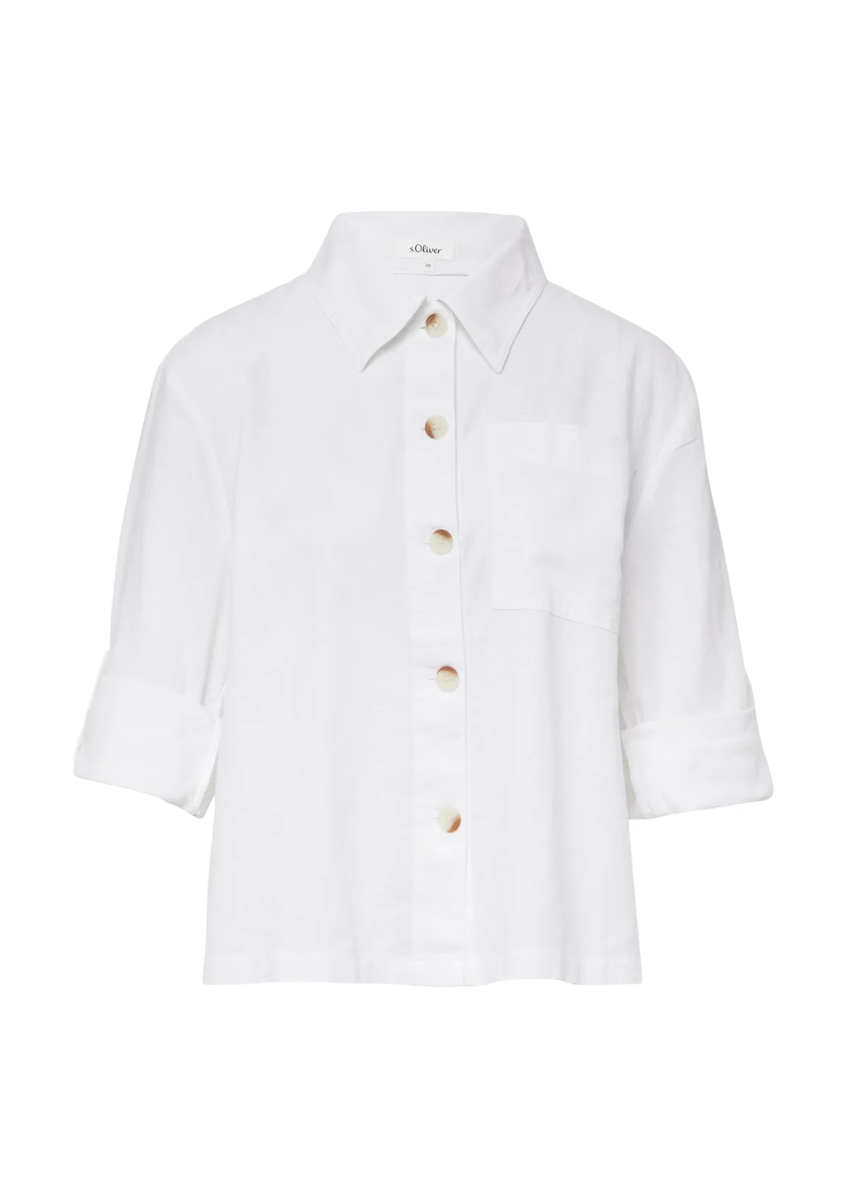 Blouse type: Klassieke blouse; Design: Borstzak; Type sluiting: Knoopsluiting; Materiaal: Linnen; Motief: Effen; Kraag: Kentkraag; Details: Plooien; Extra's: Op staal naden, Voelt zacht aan; Pasvorm: Losse pasvorm; Armlengte: Driekwart mouw; Lengte: Normale lengte