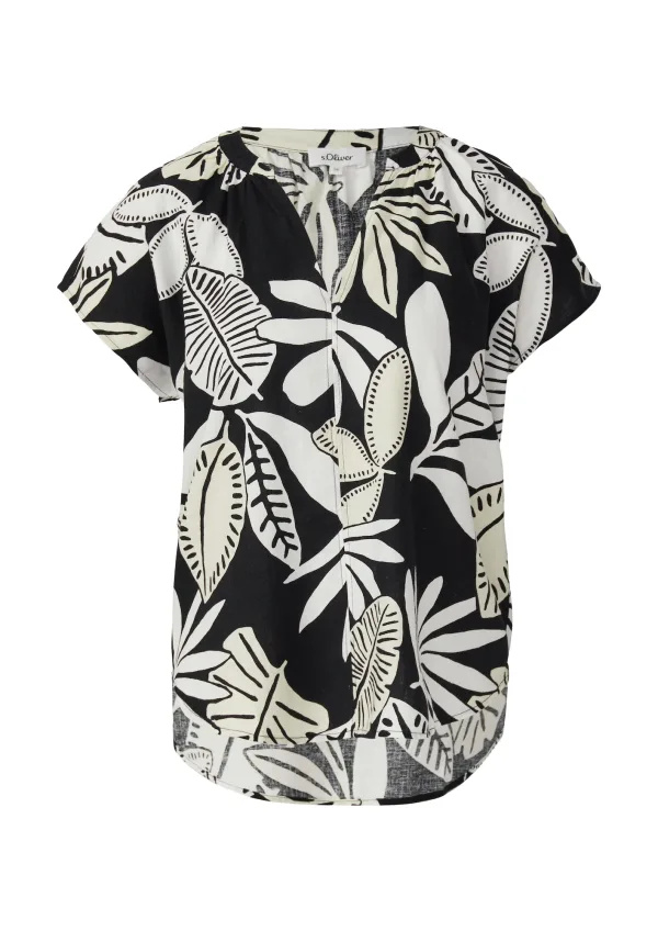 Blouse type: Blouseshirt; Design: Gevoerde zoom/rand, Gesneden mouw, Ronde zoom, Diepe snit/decolleté, Verlengd rugpand; Materiaal: Linnen; Motief: Bloemenprint; Kraag: Tuniek kraag; Details: Gedrapeerd; Extra's: All-over patroon, Lichte stof, Voelt zacht aan; Pasvorm: Normale pasvorm; Armlengte: Kwartmouw; Lengte: Normale lengte