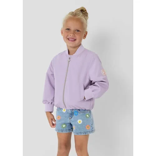 Met deze lila bomberjas voor meisjes van s.Oliver is jouw kind klaar voor alle frisse lentedagen en koele zomeravonden. De buitenjas heeft de herkenbare bomberstijl, maar dan in een zachte lila kleur die meteen opvalt. De ronde hals met geribde rand en de elastische boorden zorgen voor een comfortabele pasvorm die goed blijft zitten, of er nu gerend, geklommen of gefietst wordt.Lichte meisjesjas met praktische details Korte buitenjas in bomberstijl, ideaal voor lente en zomer Regular fit, waardoor er nog makkelijk een T-shirt of dunne trui onder past Ritssluiting aan de voorkant voor snel aan- en uittrekken Ronde hals met geribde rand voor een zachte aansluiting in de nek Lange mouwen met elastische manchetten die goed op de polsen blijven Elastische zoom zodat de jas op de heup valt en wind minder snel inwaait Glad gevoerde binnenkant voor extra draagcomfort Zakken voor met omboorde rand waar kleine schatten in passen Effen lila kleur met labelpatch en patches als speelse detailsVoor schooldagen en vakantie-avonturenDe jas past goed bij de dagelijkse outfits van peuter, kleuter en schoolkind. Door de lichte kwaliteit is dit een fijne laag over een shirt of jurk op frissere dagen, zowel op het schoolplein als tijdens vakantie-uitjes. Sneakers eronder en je kind is klaar om op pad te gaan.s.Oliver: dagelijks draagbaar en doordachts.Oliver maakt kleding die aansluit op het dagelijks leven van kinderen, met aandacht voor pasvorm en praktische details. Deze buitenjas past daar goed bij, dankzij de comfortabele snit en de doordachte afwerking. Zo ontstaat een jas die kinderen elke dag prettig kunnen dragen.Een lila bomberjas die goed aansluit bij uiteenlopende outfits in de garderobe.