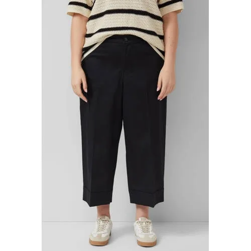 Deze zwarte culotte broek met wide leg van s.Oliver Curve is een fijne basic voor elke dag. De high rise taille en regular fit zorgen voor een ontspannen, maar verzorgde look. Door de cropped lengte vallen de pijpen net boven de enkel, wat luchtig oogt en ruimte laat voor je favoriete sneakers, loafers of sandalen.Culotte in katoen-stretch High rise taille die prettig om het middel sluit Regular fit bovenbenen met wide leg pijpen voor extra bewegingsvrijheid Cropped lengte met omgeslagen pijpen voor een moderne uitstraling Gemaakt van katoen-stretch (98% katoen / 2% elastine) voor een soepele fit Rits- en knoopsluiting aan de voorkant Steekzakken voor en zakken achter, aangevuld met sierzakken Effen zwarte kleur, makkelijk te combineren in je dagelijkse garderobeGeschikt voor dagelijks dragenDeze culotte valt onder de 'Daily' collectie en past goed in een garderobe voor alledaagse momenten. Combineer met een eenvoudig T-shirt voor een casual look of met een blouse voor een meer geklede uitstraling. De zachte katoenmix voelt prettig aan op de huid en de elastine geeft net genoeg stretch om comfortabel te bewegen.s.Oliver Curve voor een comfortabele pasvorms.Oliver Curve richt zich op grote maten met modellen die rekening houden met rondingen. De pasvorm is ontworpen zodat de broek mooi aansluit in de taille en voldoende ruimte biedt bij heupen en bovenbenen. Zo biedt s.Oliver Curve mode die zowel modieus als draagbaar is in het dagelijks leven.Een veelzijdige culotte die je gemakkelijk vaak uit de kast pakt.