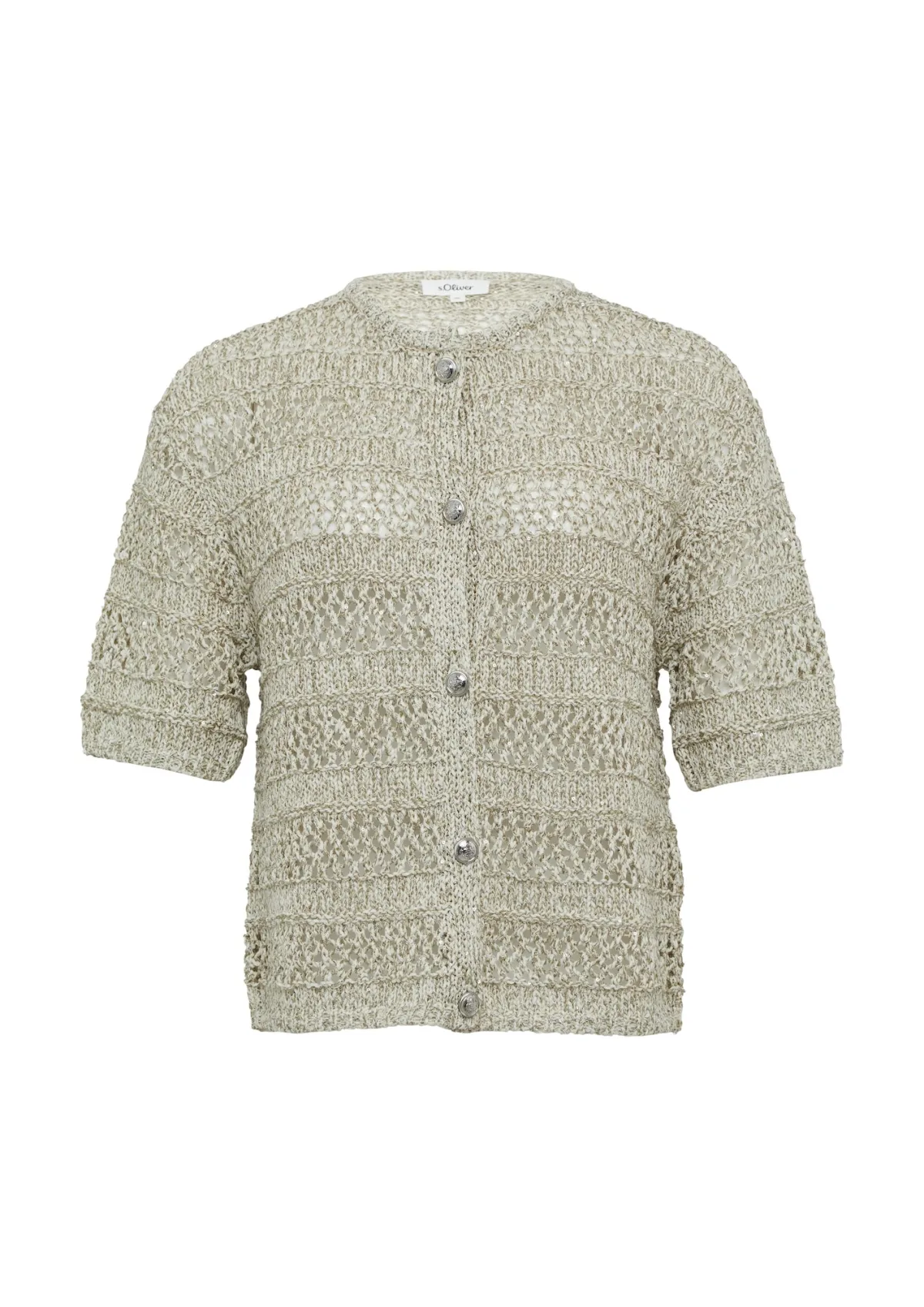 Design: Rechte zoom, Knop placket; Type sluiting: Knoopsluiting; Materiaal: Knitwear; Halstype: Ronde hals; Motief: Gestreept; Details: Mesh; Extra's: Glitterend, Met textuur; Pasvorm: Normale pasvorm; Armlengte: Halve mouw; Lengte: Normale lengte