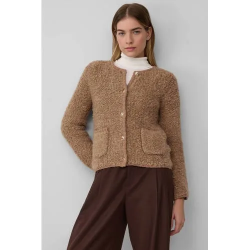 Dit vest van s.Oliver heeft lange mouwen en een ronde hals met een knoopsluiting. Dit vest is gemaakt van wol, heeft rechte mouwen, zakken voor en een contrast bies.