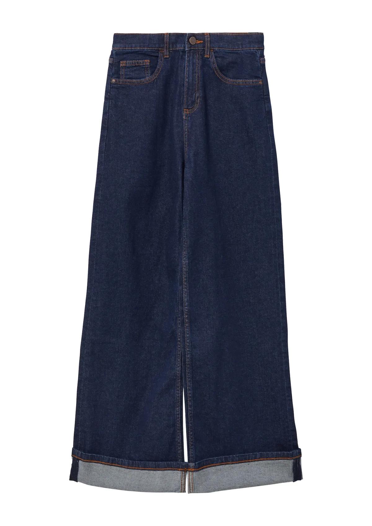 Design: Omgeslagen zoom, Ritssluiting, 5-pocket-style; Type sluiting: Ritssluiting; Materiaal: Denim; Motief: Effen; Extra's: Contrasterende naden, Riemlussen; Wassing: Rinsed/dark washed; Lengte: Lang/maxi; Pasvorm: Wide leg