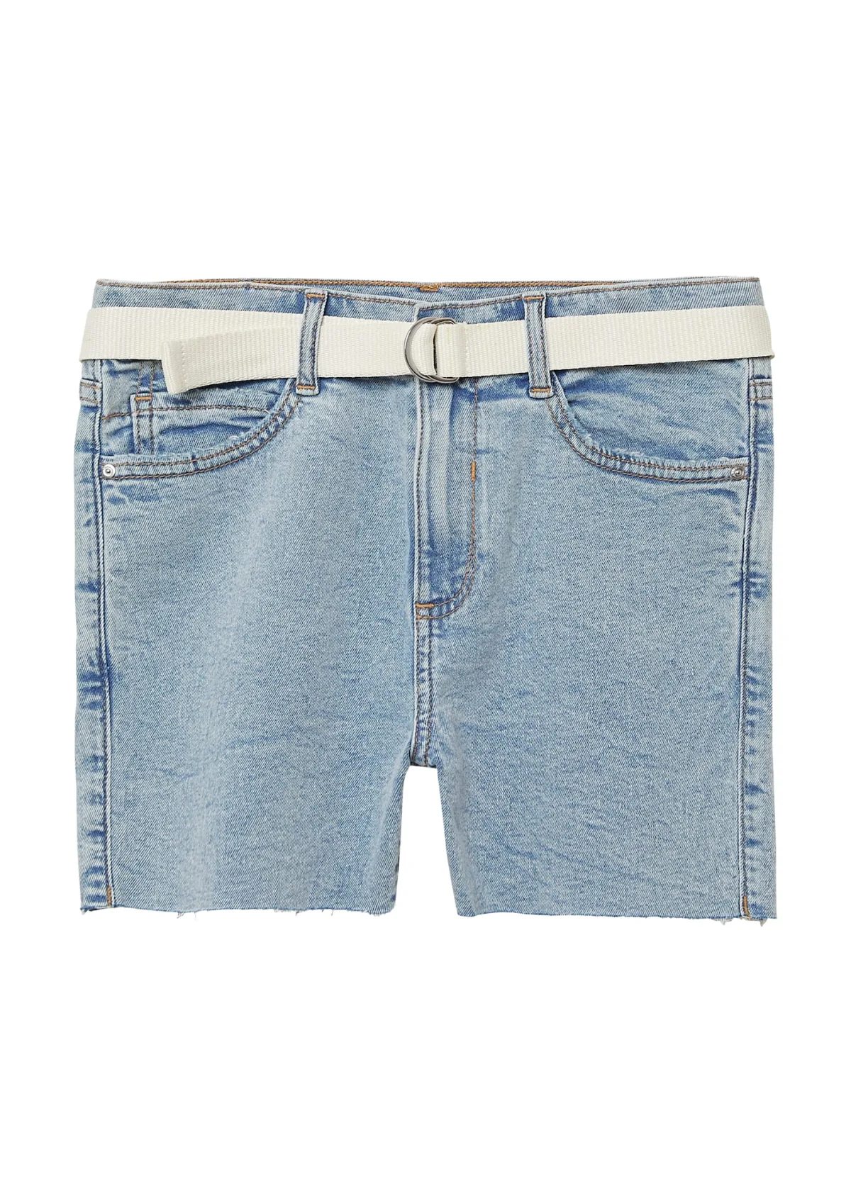 Design: Gefranjerde zoom, 5-pocket-style, Met riem; Type sluiting: Ritssluiting; Materiaal: Denim; Motief: Effen; Details: Franjes; Extra's: Contrasterende naden, Gewassen effect, Riemlussen; Wassing: Light washed; Lengte: Kort/mini; Pasvorm: Slimfit