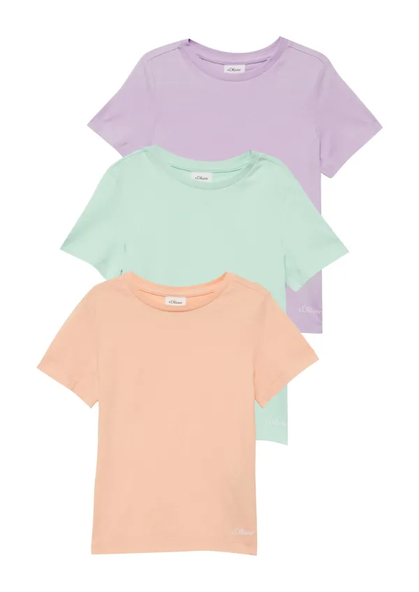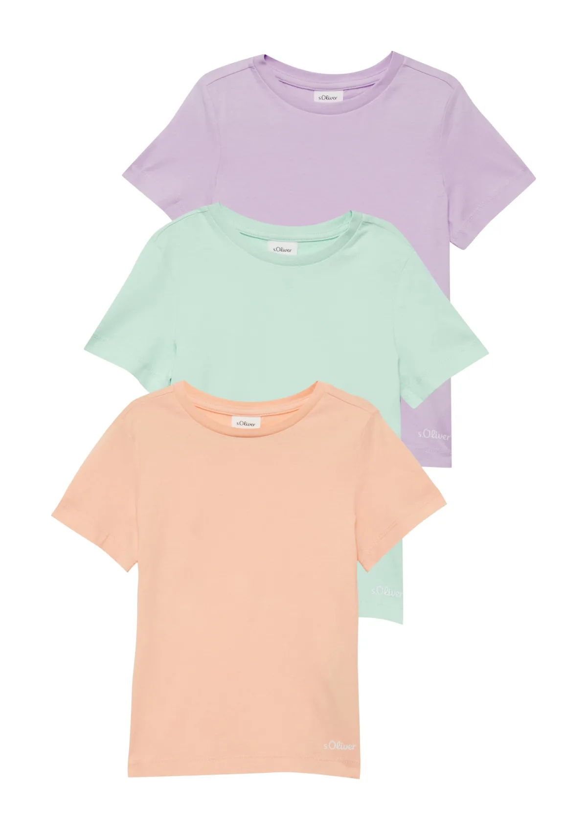 Met deze set van drie s.Oliver meisjes T-shirts heb je in één keer een fijne basis voor elke dag. De T-shirts zijn gemaakt van zacht jersey van 100% katoen en voelen soepel aan op de huid. Ideaal voor drukke dagen op school, een speelmiddag of een relaxmoment thuis. De lichtgroene, oranje en lila kleuren geven elke outfit een frisse, vrolijke uitstraling.Fijne basics in drie kleuren Set van drie T-shirts in lichtgroen, oranje en lila, handig als dagelijkse basis Gemaakt van 100% katoen, zacht en comfortabel voor de kinderhuid Regular fit voor een ontspannen pasvorm met voldoende bewegingsruimte Korte, rechte mouwen die makkelijk te combineren zijn met vest of jasje Ronde hals met geribde rand die mooi aansluit en goed in model blijft Effen design met subtiele labelprint voor een rustige, toch verzorgde look Jersey stof die soepel valt en eenvoudig te onderhouden isMakkelijk combineren, elke dag opnieuwDe T-shirts passen goed bij jeans, short of rok en schuiven makkelijk onder een trui of hoodie. Door de drie verschillende kleuren is er altijd een shirt dat past bij de rest van de outfit.s.Oliver, vertrouwd in kinderkledings.Oliver staat bekend om praktische, doordachte kleding voor elke dag. Met aandacht voor draagcomfort en tijdloze ontwerpen maakt het merk kinderkleding waar je op kunt rekenen, seizoen na seizoen.Een praktische set T-shirts die elke kinderkledingkast direct compleet maakt.