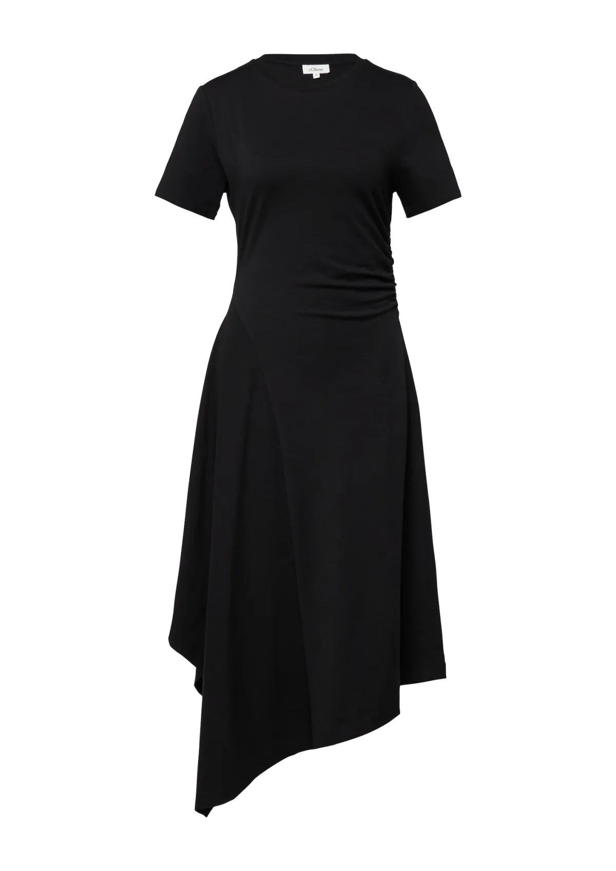 dames jersey jurk van s.Oliver RED LABEL;look: all-over motief;pasvorm: getailleerd;Lengte: midi;hals: ronde hals;Patroon: gestreept;Details: rimpeling;mouwvorm: korte mouw;Zoom: asymmetrisch;materiaalverwerking: jersey;Materiaal: katoenmix
