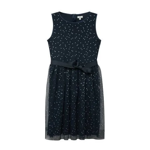 Voor een feestelijke dag of een bijzondere gelegenheid is deze s.Oliver meisjes jurk een passende keuze. De donkerblauwe jurk heeft een uitlopende pasvorm en een speelse stippenprint all-over. Door de combinatie van een transparante mesh bovenlaag en een zachte, gevoerde binnenkant voelt de jurk licht aan en valt hij mooi om het lichaam. De bijpassende ceintuur accentueert subtiel de taille en zorgt voor een verzorgd geheel.Feestelijke details in donkerblauw mesh Gestippelde mesh stof over de hele jurk voor een speels effect Mouwloos ontwerp met ronde hals, ideaal voor feestelijke gelegenheden Uitlopende pasvorm voor extra bewegingsvrijheid Blinde ritssluiting op het achterpand voor een rustige, nette uitstraling Zachte jersey voering met viscosemix voor extra comfort op de huid Ceintuur in de taille voor een mooi silhouet Korte lengte, perfect te combineren met maillot of blote benenKlaar voor elk feestjeDeze donkerblauwe jurk is gemaakt voor momenten waarop het net iets specialer mag zijn. Of het nu gaat om een verjaardag, schoolfeest of familie-etentje, met de stippenprint en de lichte mesh stof ziet de outfit er direct verzorgd uit. Combineer de jurk met ballerina's of sandalen en eventueel een vestje voor extra warmte.s.Oliver: vertrouwde kwaliteit voor elke dags.Oliver staat bekend om comfortabele kleding met een doordachte pasvorm. Ook bij deze meisjesjurk is aandacht besteed aan draagcomfort en afwerking, zoals de voering van jersey en de nette blinde rits. Zo ontstaat een feestelijke jurk waar kinderen zich vrij in kunnen bewegen en die keer op keer mooi blijft.Een feestjurk die stijl en draaggemak op een toegankelijke manier samenbrengt.