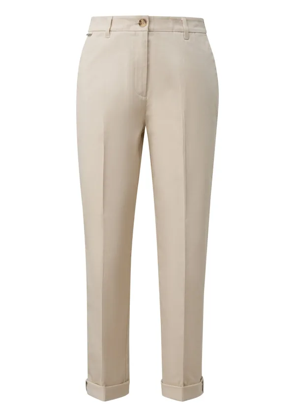 Chino van s.Oliver BLACK LABEL voor dames;Look: effen;Pasvorm: Slim fit;Details: Persplooien;Sluiting: Knoop en blinde ritssluiting;Band: elastisch;Pijpboord, met omslag;Zakken: steekzakken opzij, gestileerde achterzak;Materiaalverwerking: Satijn;Materiaal: Katoenmix