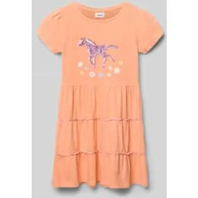 Kinderen vrijetijdsjurk van s.Oliver RED LABEL;look: effen;pasvorm: getailleerd;Lengte: midi;hals: ronde hals;Applicatie: motiefprint, paillettenzetting;mouwvorm: korte mouw;Zoom: volant;materiaalverwerking: jersey;Materiaal: puur katoen