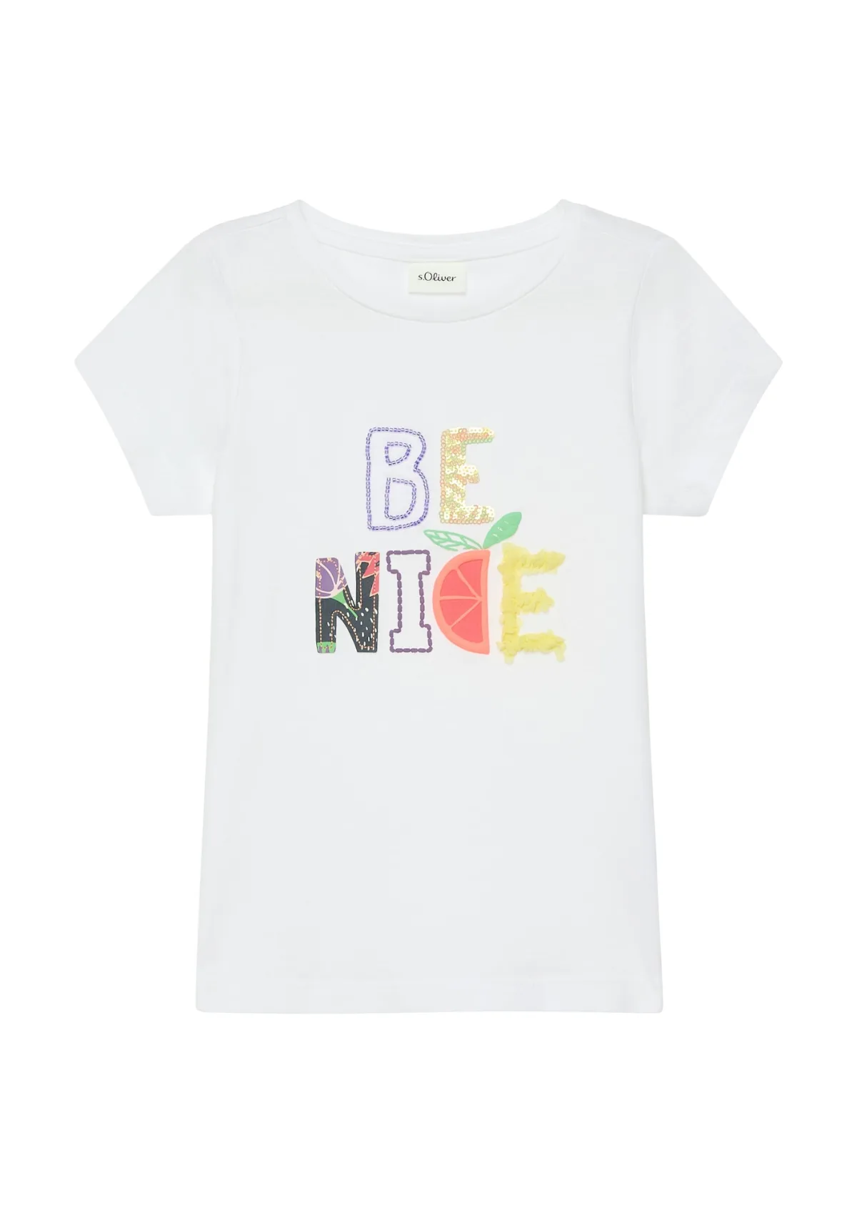 Design: Gevoerde zoom/rand; Materiaal: Jersey; Halstype: Ronde hals; Motief: Tekst print; Details: Pailletten; Extra's: Applicaties; Pasvorm: Normale pasvorm; Armlengte: Kwartmouw; Lengte: Normale lengte