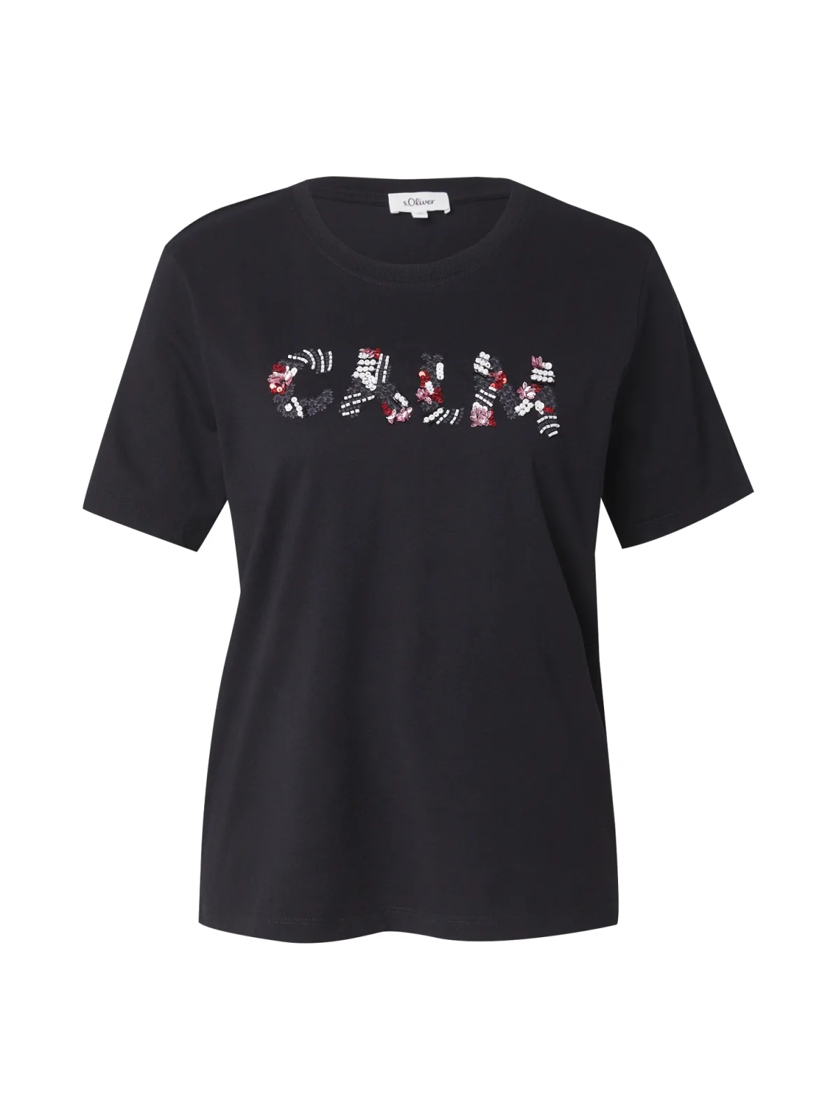 Design: Gevoerde zoom/rand, Rechte zoom; Materiaal: Jersey; Halstype: Ronde hals; Motief: Tekst print; Details: Pailletten, Borduursels, Parels; Extra’s: Applicaties, Voelt zacht aan; Pasvorm: Losse pasvorm; Armlengte: Kwartmouw; Lengte: Normale lengte