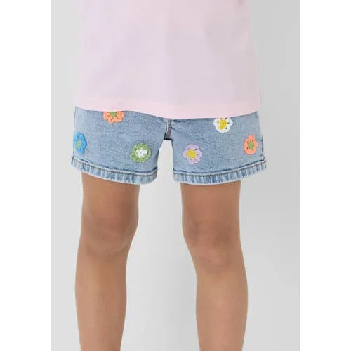 Kinderen korte jeans van s.Oliver RED LABEL;Look: denim;Pasvorm: regular fit;Applicatie: bloemenapplicatie;Details: riemlussen;Sluiting: schuifhaak en verborgen ritssluiting;boord: met verstelbare wijdte aan de binnenkant;Zakken: Steekzakken, Achterzakken
