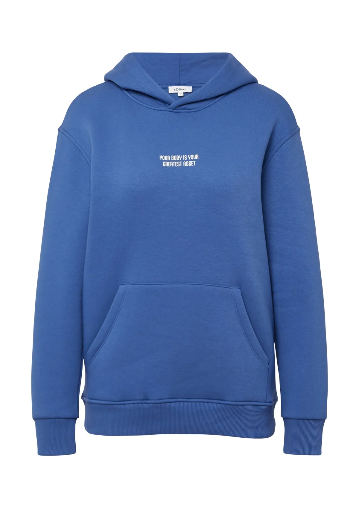 Design: Geribd ceintuurtje, Overcut schouder, Kangaroo zak; Materiaal: Sweatstof; Halstype: Capuchon; Motief: Tekst print; Extra's: Voelt zacht aan, Huidvriendelijk materiaal; Pasvorm: Losse pasvorm; Armlengte: Lange mouw; Lengte: Normale lengte