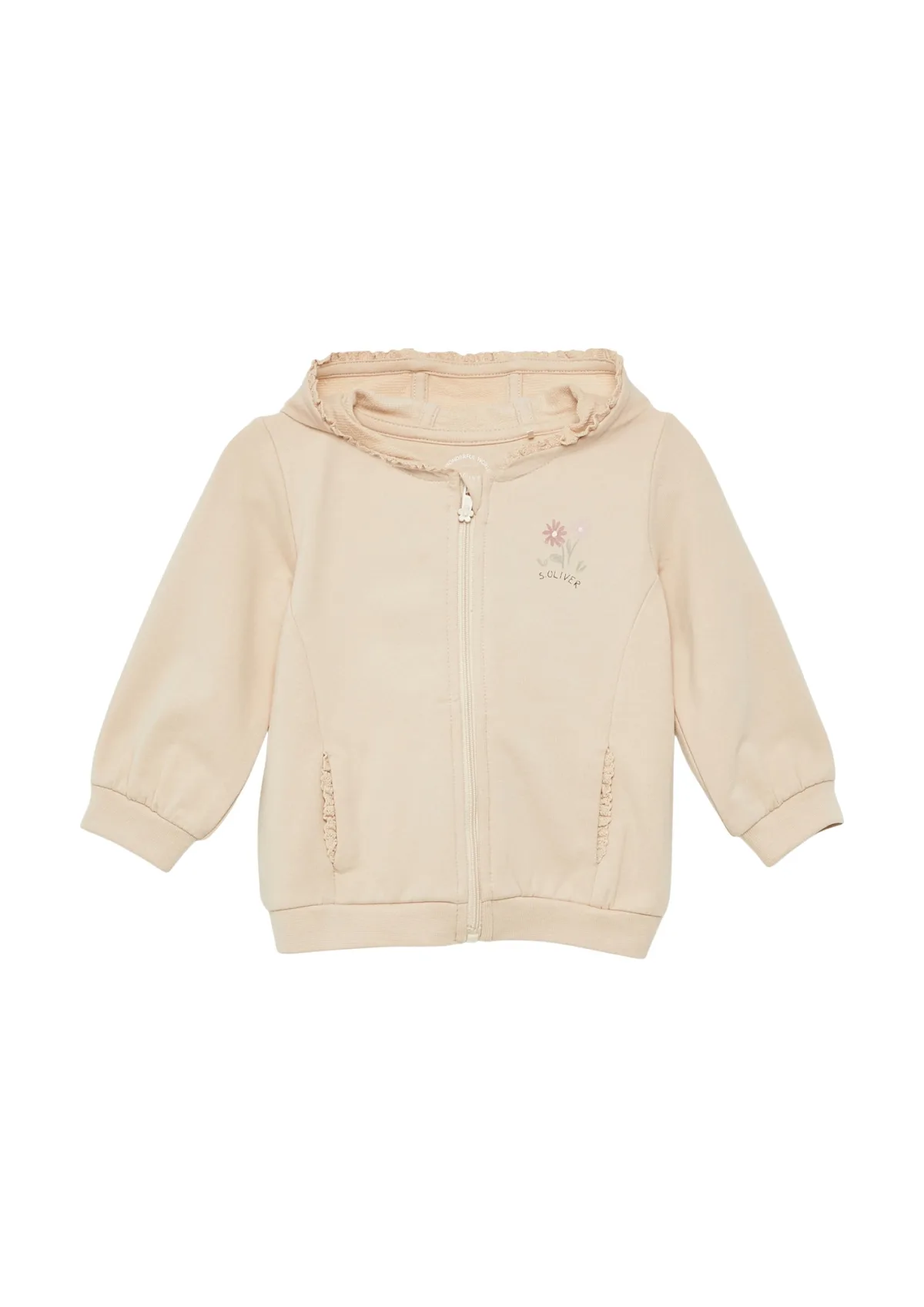 Design: Zakken aan de zijkant, Nektape; Type sluiting: Ritssluiting; Materiaal: Sweatstof; Halstype: Capuchon; Motief: Bloemenprint; Details: Ruches; Extra's: Op staal naden, Voelt zacht aan, Label print; Pasvorm: Normale pasvorm; Armlengte: Lange mouw; Lengte: Normale lengte