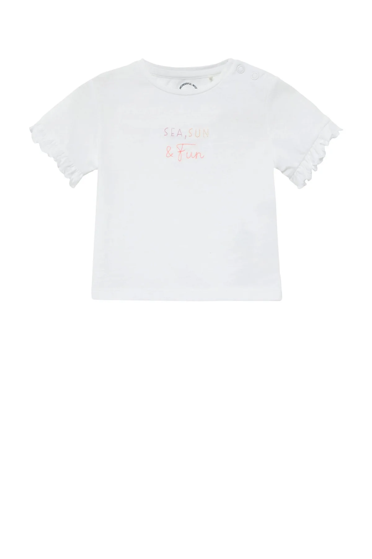 Design: Gevoerde zoom/rand; Type sluiting: Drukknoop; Materiaal: Jersey; Halstype: Ronde hals; Motief: Tekst print; Details: Ruches, Borduursels; Extra's: Voelt zacht aan; Pasvorm: Normale pasvorm; Armlengte: Kwartmouw; Lengte: Normale lengte