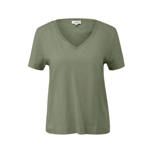 Deze kakigroene katoenen dames top van s.Oliver is een ontspannen basic voor elke dag. De V-hals met geribde rand en de subtiele pas aan de voorkant geven een rustige, vrouwelijke uitstraling. Dankzij de relaxed fit en het zachte jersey van 100% katoen voelt deze top luchtig aan en valt hij soepel om je lichaam, ideaal voor casual momenten in het voorjaar.Comfortabele details voor elke dag Relaxed fit voor een losse, comfortabele pasvorm Gemaakt van 100% katoen voor een zachte touch op de huid Jersey met slubgaren voor een licht gemêleerde, levendige structuur V-hals met geribde rand zorgt voor een mooie, open halslijn Korte rechte mouwen, prettig voor het lente- en zomerseizoen Effen kakigroene kleur, makkelijk te combineren in je garderobeCasual styling in kakigroenDeze top past goed bij een casual jeans of een luchtige chino. Voor een relaxte dag combineer je hem met sneakers en een vest, op warmere dagen draag je hem simpel met een short en sandalen. De effen kleur maakt het eenvoudig om accessoires toe te voegen, van een subtiele ketting tot een opvallende tas.s.Oliver: dagelijkse mode met aandacht voor details.Oliver brengt moderne, toegankelijke mode die gemakkelijk te stylen is. Met aandacht voor pasvorm en comfortabele materialen biedt het merk kledingstukken die geschikt zijn voor dagelijks gebruik. Deze top sluit daarop aan en is een praktische basic voor je vaste rotatie.Een rustige, zachte basis waarmee je zonder moeite een ontspannen, alledaagse look creëert.