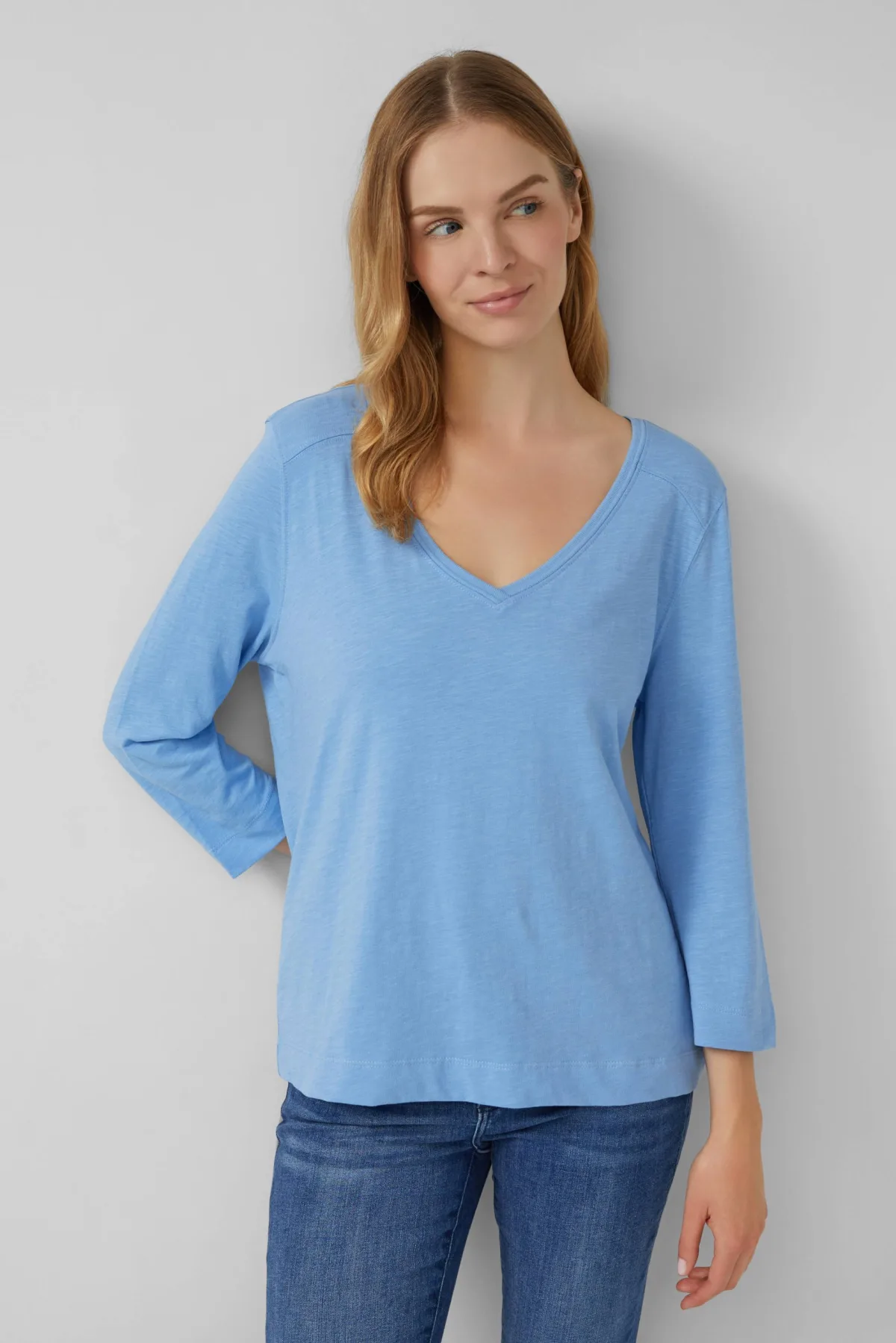 Design: Gevoerde zoom/rand, Rechte zoom; Materiaal: Katoen; Halstype: V-hals; Motief: Effen; Extra's: Op staal naden, Voelt zacht aan; Pasvorm: Normale pasvorm; Armlengte: Driekwart mouw; Lengte: Normale lengte