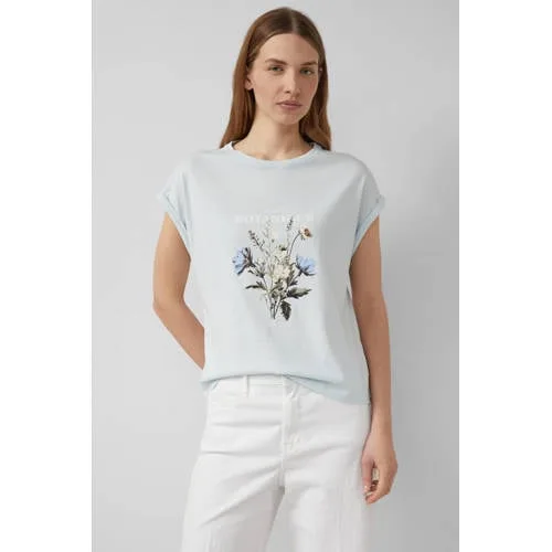 Deze lichtblauwe dames top met print van s.Oliver is een item dat je gemakkelijk combineert met verschillende outfits. De zachte jersey van 100% katoen voelt soepel aan op je huid en de relaxed fit geeft je alle bewegingsruimte die je zoekt. De ronde hals en de vaste omslag aan de korte mouwen zorgen voor een casual uitstraling die goed past bij je dagelijkse looks. Voorop staat een print die deze verder effen top net dat extra detail geeft.Comfortabele details voor elke dag Gemaakt van 100% katoen, in een zachte jersey kwaliteit Relaxed fit voor een losjes vallend silhouet Korte mouwen met vaste omslag en oversized schouders voor een nonchalante look Ronde hals, makkelijk te combineren met allerlei sieraden Effen lichtblauwe kleur met print op de voorkant Labelpatch als subtiel merkdetail Geschikt voor casual gelegenheden en dagelijkse outfitsMakkelijk stylen in je zomergarderobeDeze top komt uit de Daily collectie en sluit goed aan bij je zomergarderobe. Combineer met een denim short en sandalen voor een vrije dag, of draag de top met een luchtige broek en sneakers voor een comfortabele werk- of schooldag. Door de relaxed fit kun je de zoom zowel los dragen als half in je broek stoppen.s.Oliver als vertrouwde basiss.Oliver richt zich op toegankelijk design met een pasvorm voor elke dag. De collecties draaien om draagbare mode met aandacht voor comfort en vorm, met details die je outfits net wat meer karakter geven.Een praktische basis voor casual dagen waarop je comfort en een ontspannen stijl combineert.