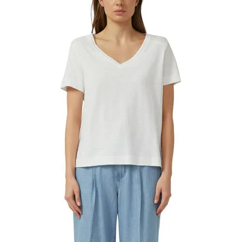 Deze witte katoenen dames top met V-hals van s.Oliver is zo'n basisstuk waar je elke dag naar grijpt. De relaxed fit valt mooi losjes om je lichaam en de zachte jersey van 100% katoen voelt prettig aan op de huid. De subtiele structuur van slubgaren geeft de effen stof net wat meer karakter, zonder dat het druk oogt.Zachte basic met doordachte details Gemaakt van 100% katoen, zacht en comfortabel voor dagelijks gebruik Relaxed fit voor een losse, nonchalante pasvorm V-hals met geribde rand voor een vrouwelijk en verzorgd detail Korte, rechte mouwen die soepel langs je armen vallen Effen witte kleur die makkelijk combineert met je garderobe Jersey met slubgaren voor een subtiele, casual structuur in de stofMakkelijk te stylen, elke dag van de weekDeze top past perfect bij een casual dag. Draag hem in een lichte jeans met sneakers voor een ontspannen lente-outfit, of combineer met een rok en sandalen voor een iets gekledere look. De effen witte kleur vormt een rustige basis onder een vest, blazer of gebreid truitje.s.Oliver: eigentijds en vertrouwds.Oliver staat bekend om toegankelijke mode met een moderne, alledaagse stijl. De collecties zijn ontworpen om makkelijk te combineren en lang mee te gaan in je kast. Met deze top haal je een betrouwbaar basisitem in huis waar je het hele seizoen plezier van hebt.Een veelzijdige, comfortabele top die moeiteloos meebeweegt met jouw dag.