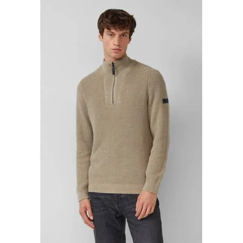 Deze trui van s.Oliver heeft een regular fit en is gemaakt van 100% katoen. De opstaande kraag en korte rits geven een sportieve uitstraling. De trui is grof gebreid en heeft geribde boorden.