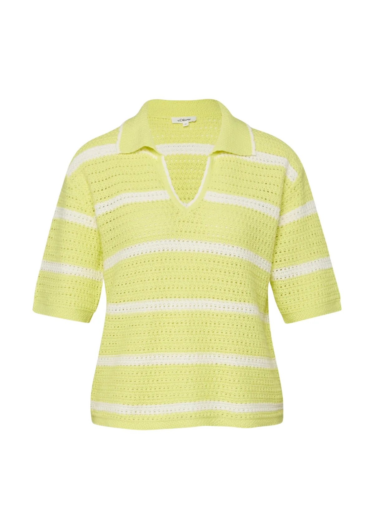 Design: Geribd ceintuurtje, Overcut schouder; Materiaal: Knitwear; Halstype: Polokraag; Motief: Gestreept; Details: Mesh; Extra's: All-over patroon, Fully fashioned, Met textuur; Pasvorm: Losse pasvorm; Armlengte: Halve mouw; Lengte: Normale lengte