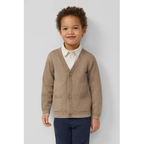 Design: Geribbelde kraag, Knop placket, Geribd ceintuurtje, Opgezette zakken; Type sluiting: Knoopsluiting; Materiaal: Knitwear; Halstype: V-hals; Motief: Mélange; Extra's: Fully fashioned, Met textuur; Pasvorm: Normale pasvorm; Armlengte: Lange mouw