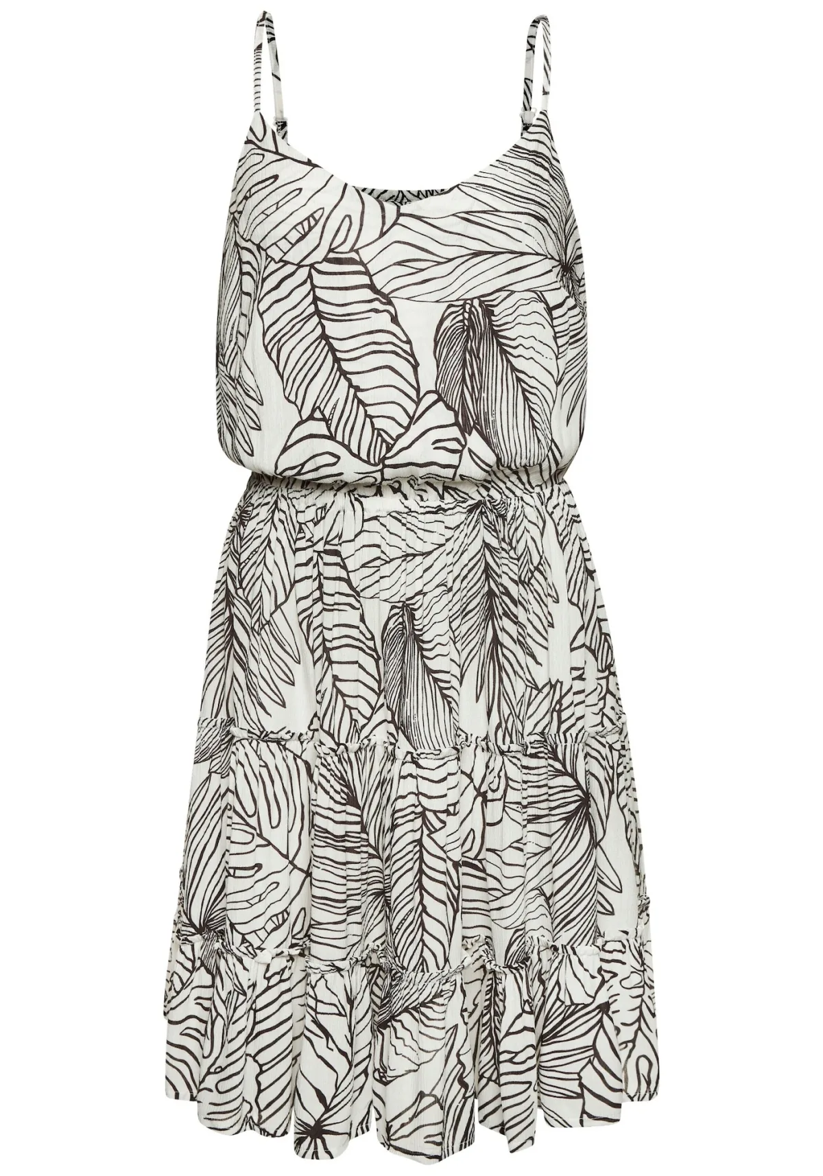 Design: Gevoerde zoom/rand; Materiaal: Viscose; Halstype: V-hals; Motief: Bloemenprint; Soort bandjes: Spaghettibandjes; Details: Volant, Gedrapeerd; Extra's: All-over patroon; Lengte: Knielengte; Snit: Getailleerd; Pasvorm: Normale pasvorm; Armlengte: Mouwloos