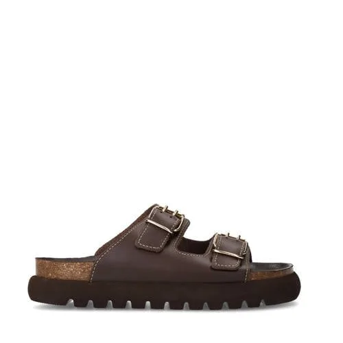 Sacha - Dames - Donkerbruine leren slippers met zilverkleurige buckles...