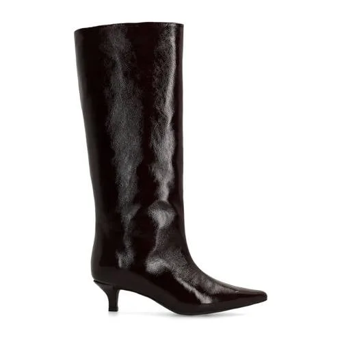Deze hoge laars van Sacha heeft een buitenkant van lak en een voering van leer. De laars heeft een kitten heel en een normale leest.
