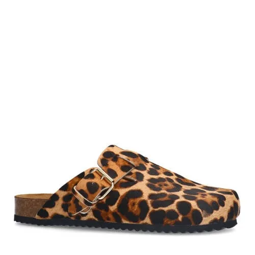 Sacha leren clogs met panterprint cognac