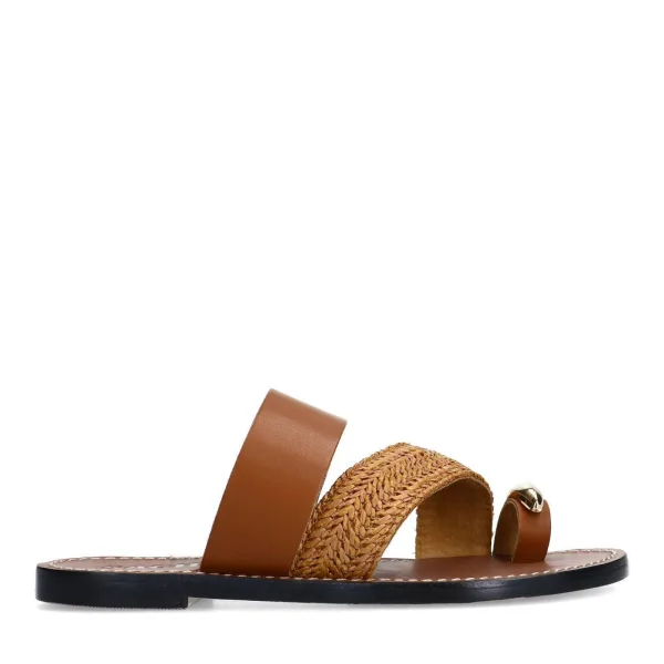Sacha - Dames - Congac leren slippers met goudkleurig detail...