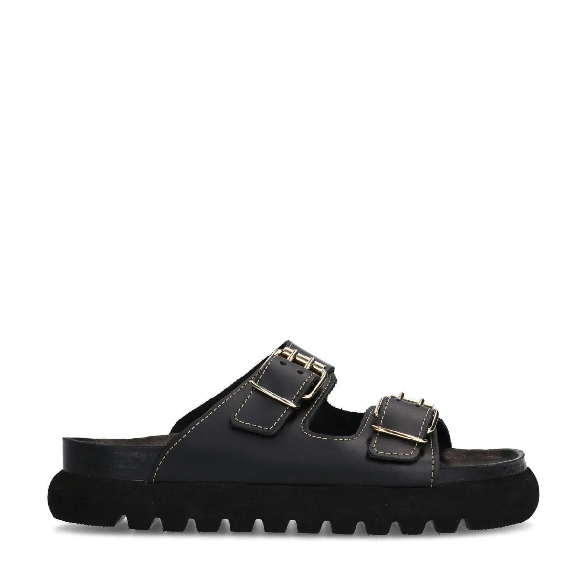 Sacha - Dames - Zwarte leren slippers met goudkleurige buckles...