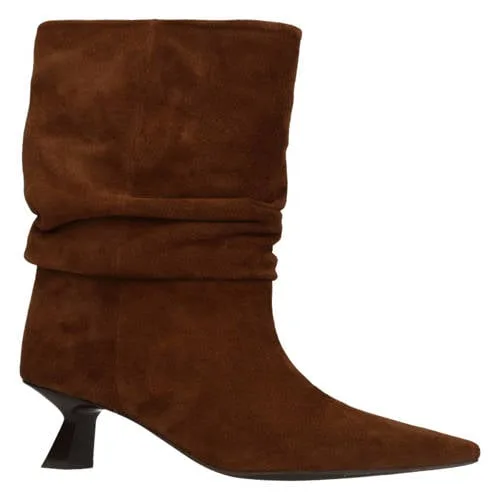 Zoek je laarsjes met een losvallende schacht? Deze bruine suède slouchy enkellaarsjes met hak van Sacha hebben een nonchalant afzakeffect en vallen direct op in je outfit. De trechterhak van 5 cm geeft subtiele hoogte, terwijl de normale leest en zachte binnenkant van leer comfortabel aanvoelen tijdens het dragen.Details die het verschil maken Bruine slouchy enkellaarsjes met afzak effect voor een losse, ontspannen uitstraling Trechterhak van 5 cm, geschikt voor dagelijks gebruik Buitenkant gemaakt van zacht suède, met effen kleur die zich makkelijk laat combineren Voering en binnenzool van leer, wat soepel om je voet vormt Schachthoogte van 20 cm en medium schachtwijdte (35-38 cm) voor een normale pasvorm rond de enkel Spitse neus en rubberen zool voor grip op verschillende ondergronden Zonder sluiting, zodat je de laarsjes eenvoudig aantrektEnkellaarsjes voor elke dagDe bruine kleur laat zich makkelijk combineren met denim, jurken of een leren rok. De slouchy schacht oogt casual, terwijl de kitten heel je silhouet optisch verlengt. Ideaal voor een werkdag, een etentje of een avond uit, zonder dat je je voeten te veel belast.Sacha schoenen met eigen karakterSacha ontwerpt schoenen met een herkenbare stijl, geïnspireerd op streetstyle en actuele trends. In de Rebel collectie vind je modellen met een duidelijke vormtaal, waarbij aandacht is voor vorm, materiaal en pasvorm. Zo kies je voor enkellaarsjes waarbij deze elementen goed op elkaar zijn afgestemd.Een paar laarsjes dat je garderobe het hele seizoen door aanvult.