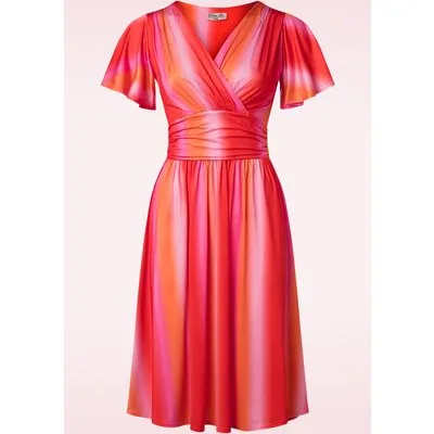 Een echte vintage beauty en perfect voor elke gelegenheid! Sadie heeft een vaste overslag, korte vlindermouwtjes en loopt vanaf de taille uit in een flowy semi-swing rok. Ze is uitgevoerd in een glad en soepel, stretchy en slinky stofje met een print van vervaagde strepen in roze en oranjetinten, dat heerlijk draagt en niet kreukt. Geniet van de complimentjes die je krijgt, zodra je Sadie draagt! * Semi-swing stijl * Gevoerde top * Vaste overslag * Korte vlindermouwen * Geplooide tailleband * Geen rits of knopen; aantrekken en ready to go! * Valt bij een lengte van 1,70 m over de knie