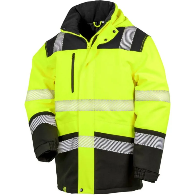 Buitenste materialen: 100% Polyester. Vulling: 100% polyester. Voering: Polyester, gewatteerd. Stof: Softshell, Garen. Ontwerp: Reflecterend. Stof Technologie: TPU Membraan, Winddicht. 2-laags, Hangtag, Stormflap, Getapete Naden. Halslijn: Kapitein. Mouwtype: Met lange mouwen. Manchet: Gedeeltelijk Elastisch. Kap Kenmerken: Verstelbaar, Opvouwbaar. Zakken: 1 borstzak. Bevestiging: Volledige ritssluiting. Waterdichte classificatie: 8000mm. 3000g/m²/24hrs. Voldoet aan veiligheidsnorm: EN ISO 20471:2013 + A1:2016 Klasse 2, EN343:2019 3:1.