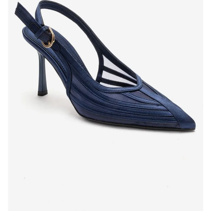 Een verfijnde stiletto geïnspireerd op natuurlijke elegantie, met een puntige silhouet, gelaagde texturen en fijne bandjes, plus een verstelbare hielband voor comfort de hele dag