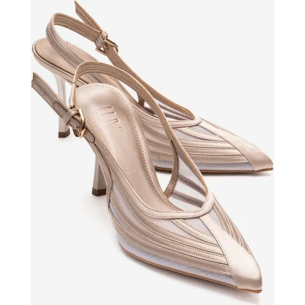 Een verfijnde stiletto geïnspireerd op natuurlijke elegantie, met een spitse neus, gelaagde texturen en fijne bandjes, plus een verstelbare hielband voor comfort de hele dag