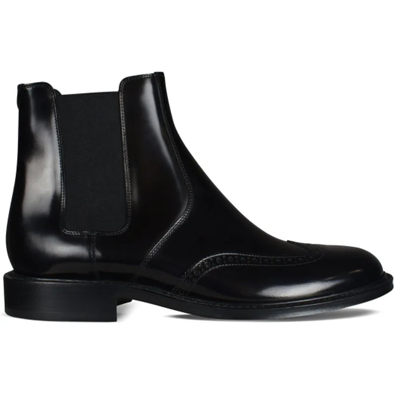 Saint Laurent Chelsea Boots, Army-model in glad zwart leer.Laarzen met ronde neus en Richelieus-perforaties aan de voorkant.Elastische inzetstukken aan de zijkanten.Gegroefde hiel.Grosgrain tong aan de achterkant.Hakhoogte: 2 cm.Leren zool.100% kalfsleer.Gemaakt in Italië.