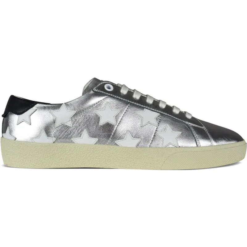 Court Classic SL/06 Saint Laurent sneakers in zilverleer met witte leren sterren.Leren interieur.Zwart lederen toonbank met het merk Saint Laurent. Rubberen zool.Gemaakt in Italië.