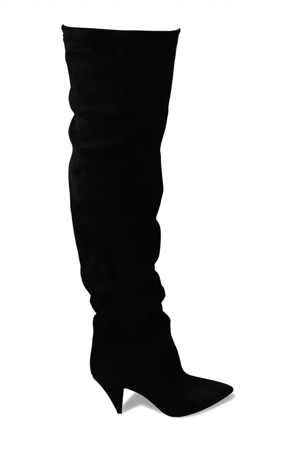 Saint Laurent Era 85 overknee laarzen van zwart suède.Kan gekruld of recht gedragen worden.Hakhoogte 8,5 cm.Leren zool.Gemaakt in Italië.