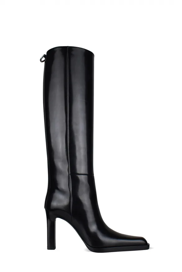 Saint Laurent Nina laarzen van glanzend zwart leer.Zilveren metalen ring aan de achterkant.Vierkante spitse neus.Hak van 9,5 cm.100% kalfsleer.Gemaakt in Italië.