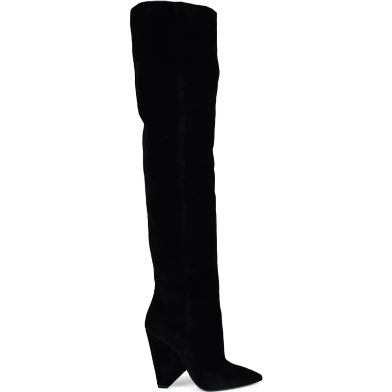 Niki Saint Laurent hoge laarzen in zwart fluweel.Amandelvormige spitse neus.Tapervormige hak.Hakhoogte 11 cm.Made in Italy.