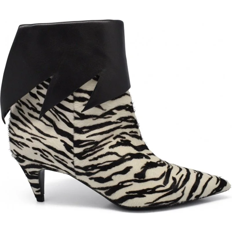 Saint Laurent enkellaarsjes met veulen met zebraeffect.Zwart leren revers met zigzaguitsnijding.Hak 6 cm.Leren zool.Gemaakt in Italië.