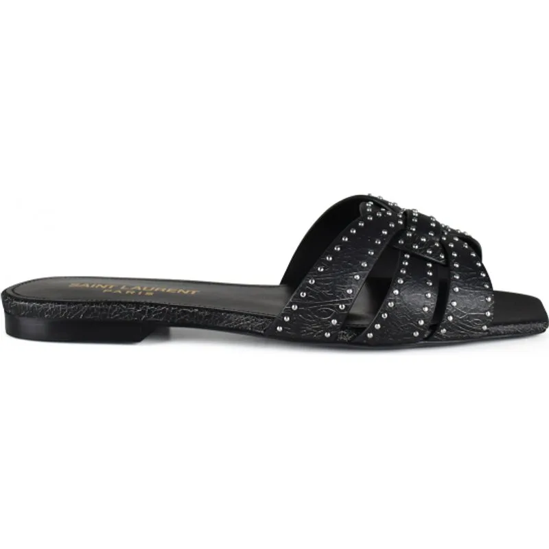 Zwarte Tribute Saint Laurent leren muiltjes. Versierd met zilveren studs op de bandjes.Verweven bandjes die het kenmerkende Tribute-patroon vormen.Open vierkante neus.Leren zool.Gemaakt in Italië.