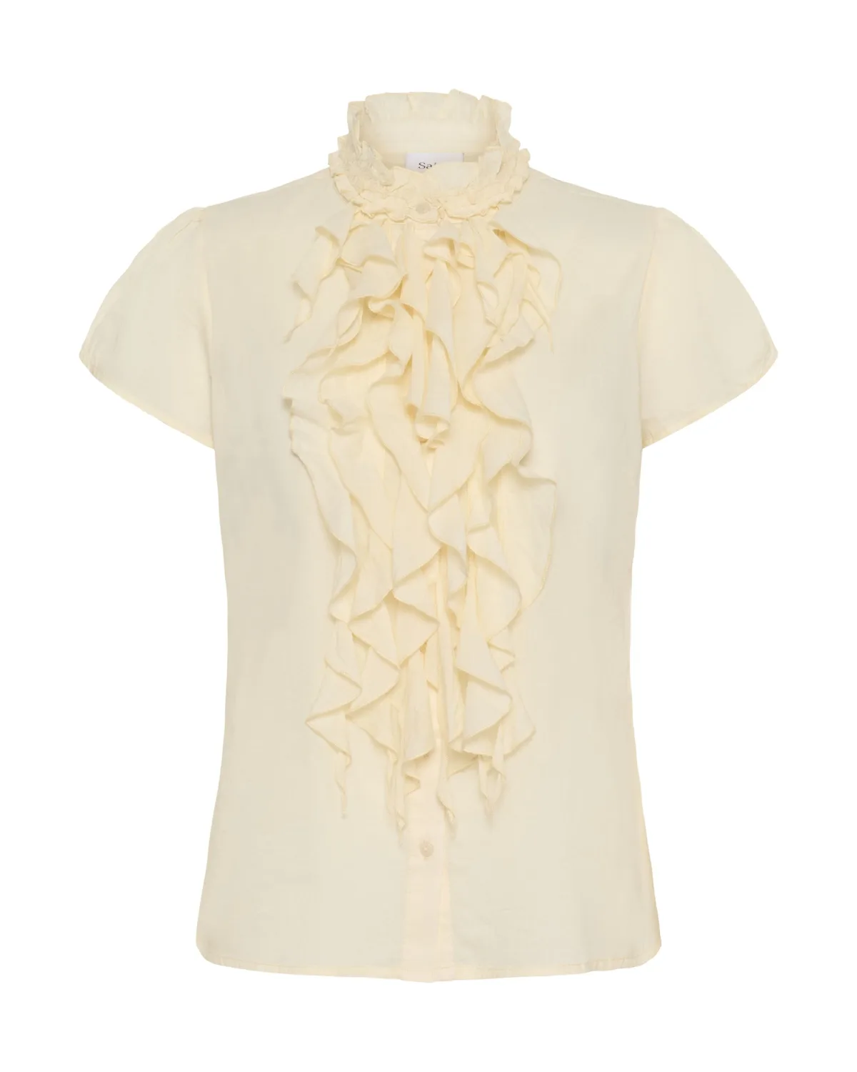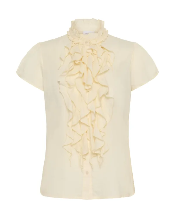 Blouse type: Klassieke blouse; Type sluiting: Knoopsluiting; Materiaal: Katoen; Motief: Effen; Kraag: Opstaande kraag; Details: Ruches, Volant; Extra's: Op staal naden; Pasvorm: Normale pasvorm; Armlengte: Kwartmouw; Lengte: Normale lengte